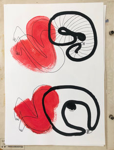 Explorar do meu jeito, no meu tempo - Esta pesquisa busca explorar os traços de diferentes pincéis transformando-os em desenhos de figuras humanas. Personificar o gesto do pincel é pra mim, uma expressão de identidade do meu traço, na tentativa de libertar a pincelada e a representação humana do realismo. O desenho passa a ser uma ideia de uma figura humana. Também o traço defini uma intenção de movimento desta figura representada e da pessoa que cria a cria, o artista, dessa maneira os dois aparecem neste desenho. Em evolução, esta pesquisa explora desenhos em diferentes superfícies, do papel à estamparias de objetos.